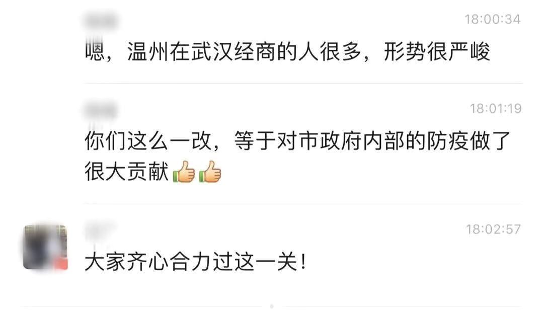 1月30日中午1时,接温州市政府通知,温州在本次疫情中感染人数全国排名第四,且杭州出现一企业30人开会11人传染新型冠状病毒的事件。为加强对疫情的管控,贯彻落实浙江省重大突发公共卫生事件一级响应机制的有关规定,温州市行政中心于30日正式复工。市政府要求行政中心消费系统进行优化升级,要求用餐时按部门分时段就餐,不在相应的时间不允许就餐,这样就能有效抑制新型冠状病毒在行政中心内部交叉感染,推进“防、控、管、治”各项工作落实到位、落地见效。